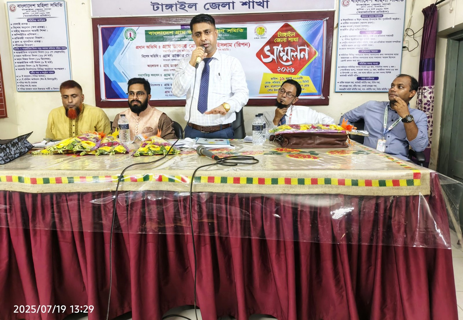 বাংলাদেশ গ্রাম ডাক্তার কল্যাণ সমিতির উদ্যোগে টাঙ্গাইল জেলা সম্মেলন অনুষ্ঠিত হয়েছে। ১৯ জুলাই শনিবার সন্ধ্যায় জেলা সদরে জাঁকজমকপূর্ণ পরিবেশে উক্ত অনুষ্ঠানটি পরিচালিত হয়েছে । উক্ত আলোচনা সভায় সভাপতিত্ব করেন বাংলাদেশ গ্রাম ডাক্তার কল্যাণ সমিতির টাঙ্গাইল জেলা শাখার সভাপতি গ্রাম ডাক্তার রাসেল মিয়া। প্রধান অতিথি হিসেবে উপস্থিত ছিলেন বাংলাদেশ গ্রাম ডাক্তার কল্যাণ সমিতির কেন্দ্রীয় কমিটির সভাপতি গ্রাম ডাক্তার মোঃ নজরুল ইসলাম (রিপন)।বিশেষ অতিথি হিসেবে উপস্থিত ছিলেন ডাঃ মোঃ মোস্তাফিজুর রহমান সহযোগী অধ্যাপক (কিডনি বিভাগ) টাঙ্গাইল মেডিকেল কলেজ হাসপাতাল। গ্রাম ডাক্তার আবু সাইদ সাধারণ সম্পাদক (কেন্দ্রীয় কমিটি) আলোচক ছিলেন গ্রাম ডাক্তার সাংবাদিক আমিনুল ইসলাম (বুলবুল) প্রচার সম্পাদক (কেন্দ্রীয় কমিটি)।অনুষ্ঠান পরিচালনা করেন গ্রাম ডাক্তার আশরাফ সিদ্দিকী সাধারণ সম্পাদক টাঙ্গাইল জেলা।উপস্থিত ছিলেন গ্রাম ডাক্তার মেহেদী আব্দুল্লাহ সহ-সভাপতি টাঙ্গাইল জেলা। গ্রাম ডাক্তার আব্দুল হালিম সাংগঠনিক সম্পাদক টাঙ্গাইল জেলা। আরও উপস্থিত ছিলেন টাংগাইল জেলার বিভিন্ন উপজেলা থেকে আগত কয়েকশত গ্রাম ডাক্তারবৃন্দ। প্রধান অতিথি তার বক্তব্যে বলেন , গ্রাম ডাক্তারগণ যেন তাদের সীমাবদ্ধতা থেকে প্রাথমিক চিকিৎসা সেবা প্রদান করেন। দেশের মহামারি ও দুর্যোগ মুহূর্তে যেন নিরলসভাবে সরকারের সহায়ক হিসেবে কাজ করে যান। টাঙ্গাইল জেলার প্রতিটি গ্রাম ডাক্তারগণকে যত তাড়াতাড়ি সম্ভব অনলাইন অন্তর্ভুক্ত হওয়ার জন্য বিশেষ ভাবে নির্দেশনা প্রদান করেন। বাংলাদেশ গ্রাম ডাক্তার কল্যাণ সমিতির টাঙ্গাইল জেলার প্রতিটি থানা ও ইউনিয়ন কমিটি গঠন করার জন্য কেন্দ্রীয় কমিটির সভাপতি নির্দেশ দেন।উপস্থিত সবাই কেন্দ্রীয় কমিটির সভাপতির বক্তব্যে একমত প্রকাশ করেন। সর্বশেষ প্রধান অতিথি উপস্থিত সবাইকে শুভেচ্ছা ও সকলের সুস্বাস্থ্য কামনা করেন। দেশের সকল গ্রাম ডাক্তার ভাই ও বোনদেরকে ঐক্যবদ্ধ হয়ে সংগঠনের কার্যক্রম ও মানুষের পাশে থেকে সেবা দেওয়ার জন্য আহবান জানিয়ে