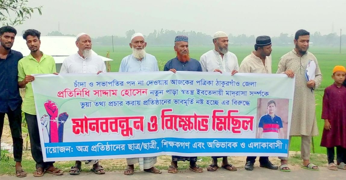 ঠাকুরগাঁওয়ে একটি মাদরাসার সভাপতির পদ না দেয়ায় কার্যক্রম পরিচালনায় বাধাদান, চাঁদা দাবি ও মিথ্যা সংবাদ প্রকাশের অভিযোগে সাদ্দাম হোসেন নামের স্থানীয় এক সাংবাদিকের বিরুদ্ধে বিক্ষোভ ও মানববন্ধন করেছেন মাদরাসার শিক্ষক, শিক্ষার্থী, অভিভাবক ও এলাকাবাসি।