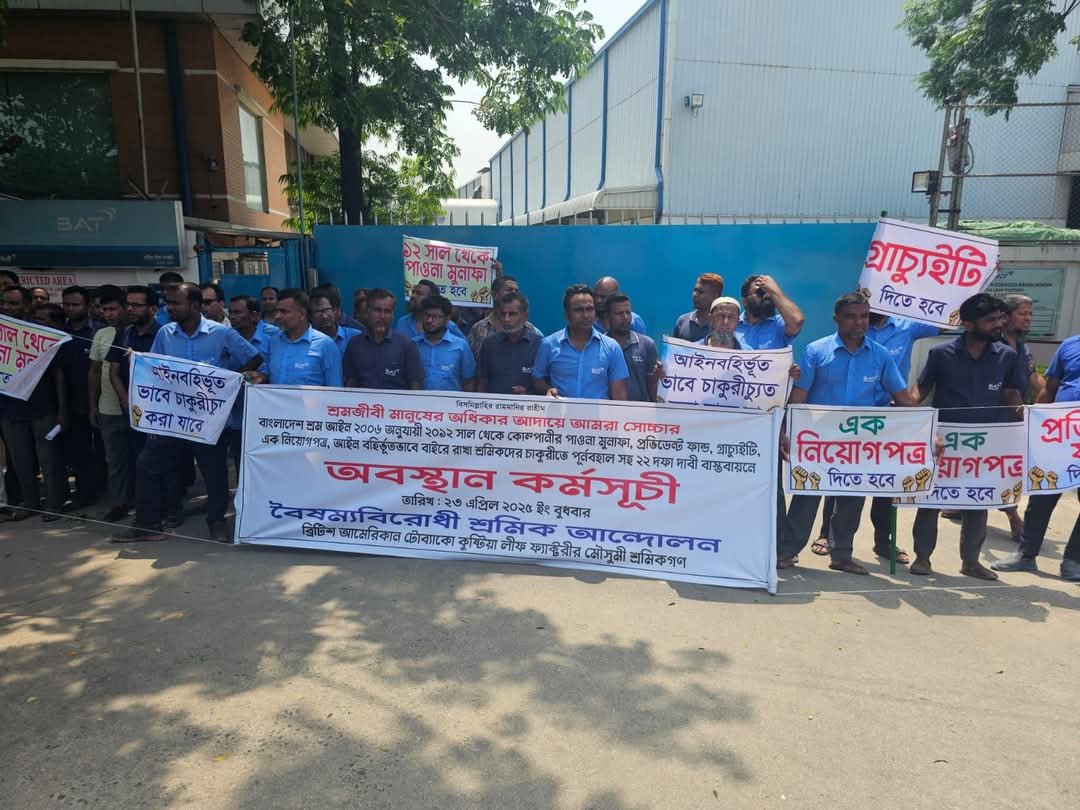 কুষ্টিয়া সদর উপজেলার কুমারগাড়া ব্রিটিশ আমেরিকান টোব্যাক লিফ ফ্যাক্টরির মৌসুমী শ্রমিকেরা অনির্দিষ্ট কালের জন্য অবস্থান কর্মসূচি পালন করছেন।