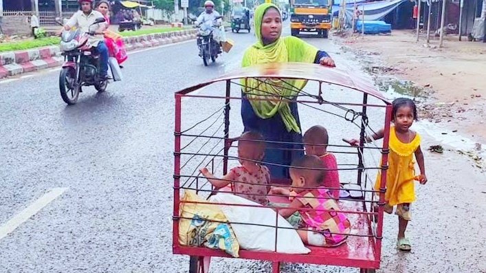 ঠাকুরগাঁও পরিষদপাড়া কিংবা কাচাবাজার আড়ৎ এলাকায় গেলে দেখা মিলবে লোহার খাঁচাদিয়ে বানানো ঠেলা গাড়িতে ১৩ মাস বয়সী তিন শিশুকে নিয়ে রাস্তায় রাস্তায় ঘুরছেন জান্নাত। খাঁচার পাশে তার সাথেই হাটছে সাড়ে ৩ বছর বয়সী আরও একটি শিশু।