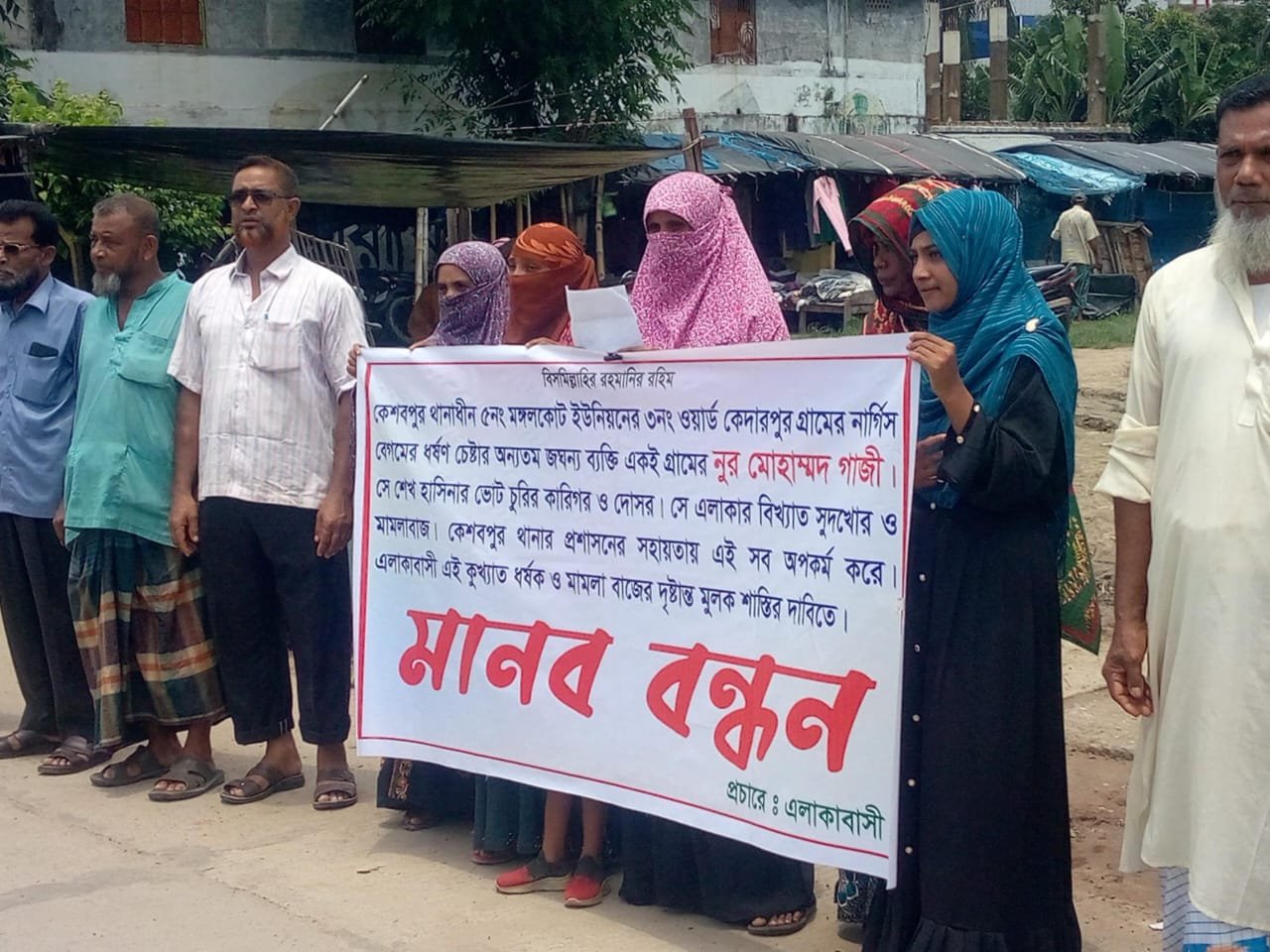 মানববন্ধনে উপস্থিত একই গ্রামের মাজেদুর রহমান বলেন, গত ২৫ জুলাই নুরমোহাম্মদ তার বাড়িতে মোবাইল ফোনের মাধ্যমে ডেকে নিয়ে ঘরের ভেতর আটকিয়ে নার্সিন বেগমকে ধর্ষনের চেষ্টা করে। এ সময় তার চিৎকারে এলাকাবাসি ঘটনাটির বিষয়ে জানতে পারে। এরপর স্থানীয় ইউপি সদস্য কামরুল ইসলাম তাকে ঘটনাস্থল থেকে উদ্ধার করে কেশবপুর থানার অফিসার ইনচার্জের কাছে নিয়ে গেলে নামে মাত্র একটি অভিযোগ নেন তিনি। তিনি এ ঘটনার সঠিক বিচারের দাবি জানান।