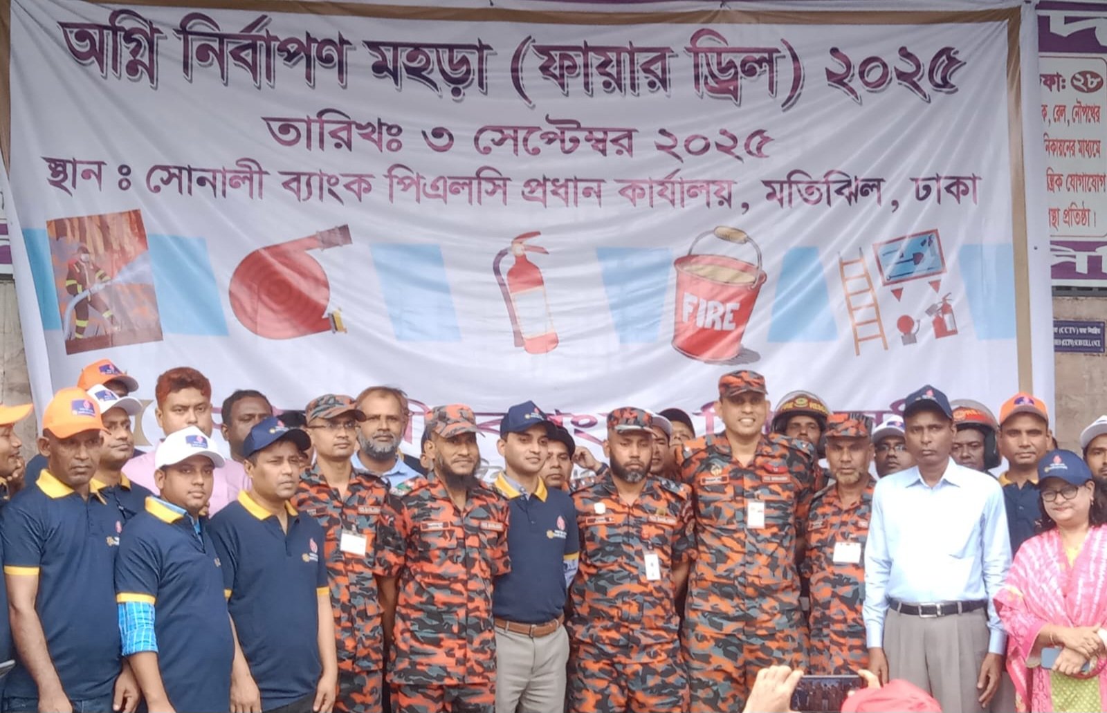রাজধানীর মতিঝিলে অবস্থিত সোনালী ব্যাংক পিএলসি’র প্রধান কার্যালয়ে আজ বুধবার অগ্নি নির্বাপণ মহড়া (ফায়ার ড্রিল) অনুষ্ঠিত হয়েছে। কর্মীদের সচেতনতা বৃদ্ধি ও জরুরি পরিস্থিতিতে দ্রুত পদক্ষেপ গ্রহণ নিশ্চিত করার লক্ষ্যে এ মহড়ার আয়োজন করা হয়।