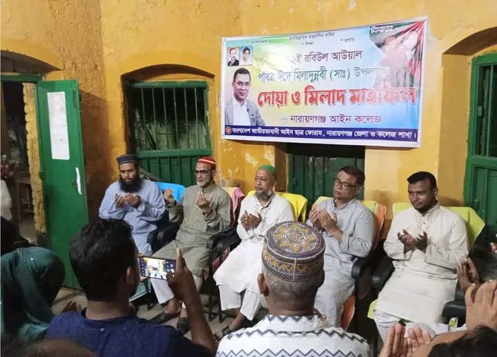দীর্ঘ ১৭ বছর পর নারায়ণগঞ্জ আইন কলেজে ধর্মীয় ভাবগাম্ভীর্য ও আনুষ্ঠানিকতার মধ্য দিয়ে ঈদে মিলাদুন্নবী (সা.) পালন করা হয়েছে। ১২ রবিউল আউয়াল, বিশ্বনবী হযরত মুহাম্মদ (সা.)-এর শুভ জন্ম ও আগমনের দিনটি স্মরণে এ আয়োজন করে নারায়ণগঞ্জ জেলা ও কলেজ শাখা জাতীয়তাবাদী আইন ছাত্র ফোরাম।