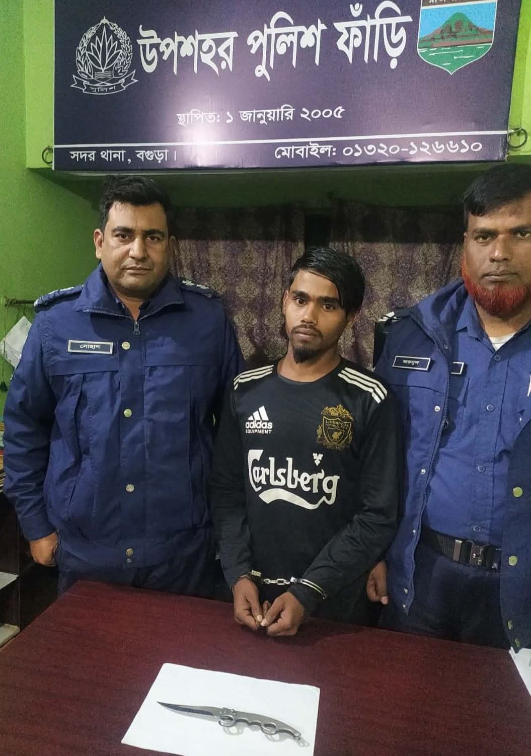 পরে শরীর তল্লাশি চালিয়ে তার কাছ থেকে একটি ধারালো বার্মিজ চাকু উদ্ধার করা হয়। গ্রেফতারকৃত যুবকের নাম মোঃ সাকিব। তিনি বগুড়া শহরতলীর ঝোপগাড়ি এলাকার মৃত বাছেদ আলীর ছেলে।