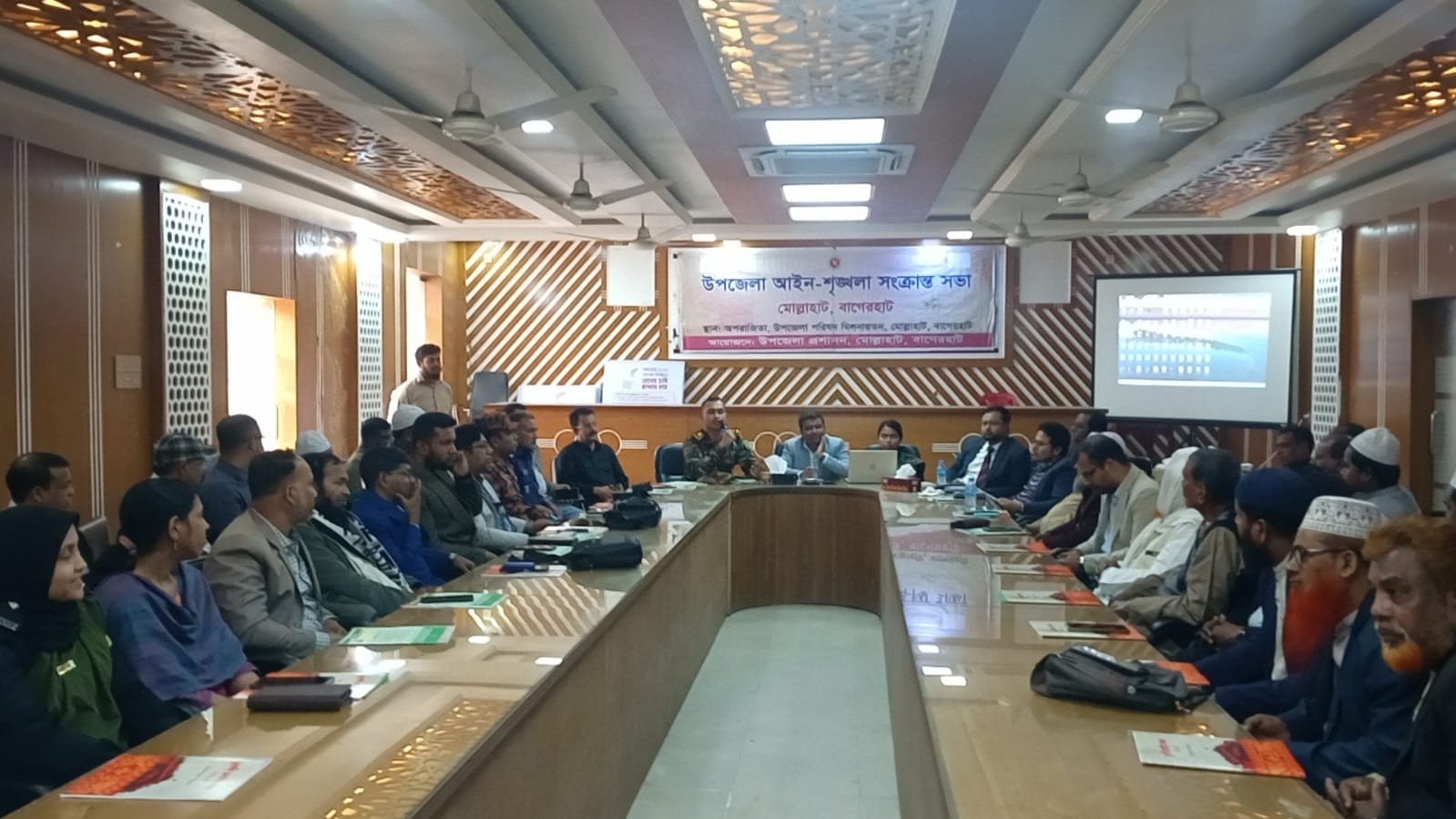 বাগেরহাটের মোল্লাহাটে উপজেলা আইন-শৃঙ্খলা ও সমন্বয় কমিটির মাসিক সভা অনুষ্ঠিত হয়েছে। বৃহস্পতিবার (২৯ জানুয়ারি) উপজেলা প্রশাসনের আয়োজনে, উপজেলা পরিষদ মিলনায়তনে অনুষ্ঠিত উক্ত সভায় সভাপতিত্ব করেন উপজেলা নির্বাহী অফিসার শ্যামানন্দ কুন্ডু। তিনি ত্রয়োদশ জাতীয় সংসদ নির্বাচনের আচরণ বিধি ও শান্তি-শৃঙ্খলা বজায় রাখার বিভিন্ন দিকনির্দেশনা প্রদান করেন। উপজেলা আইন শৃঙ্খলা কমিটির সদস্যবৃন্দ আইনশৃঙ্খলা পরিস্থিতি পর্যালোচনা করে নীজ নীজ মতামত ব্যক্ত করেন এবং মাদক ও সন্ত্রাস দমনে সম্মিলিতভাবে কাজ করার আহ্বান জানান। সভায় অন্যান্যদের মাঝে উপস্থিত ছিলেন ও বক্তব্যদেন মোল্লাহাট আর্মি ক্যাম্পের ক্যাপ্টেন শামীম আহমেদ, সহকারী কমিশনার(ভুমি) সুস্মিতা সাহা, এস আই মনজির আহমেদ, প্রাণিসম্পদ কর্মকর্তা ডাঃ মোঃ হাসান আলী, কৃষি কর্মকর্তা মোঃ ইমরান হোসেন, সিনিয়র উপজেলা মৎস্য কর্মকর্তা রাজিব রায়, উপজেলা প্রকৌশলী ফেরদৌস আলম, অতিরিক্ত কৃষি কর্মকর্তা মোঃ মেহেদী হাসান, পল্লী বিদ্যুৎ ডিজিএম বিশুদ্ধানন্দ পুরব্রাহ্মণ, উপজেলা বিএনপি’র সভাপতি শেখ হাফিজুর রহমান, সাধারণ সম্পাদক মোঃ হারুন আল রশীদ, সাবেক আহ্বায় শিকদার জামাল উদ্দিন, সাবেক সাধারণ সম্পাদক শেখ শাহেদ আলী, উপজেলা জামায়াতে ইসলামীর আমির মোঃ হাসমত আলী সরদার, সেক্রেটারি হাফেজ মোঃ হেদায়েত উল্লাহ, সহ সেক্রেটারি মোঃ নাসির উদ্দিন, উপজেলা জামায়াতের যুব বিভাগের সভাপতি মোঃ হাসান আলী, সেক্রেটারি মোঃ পারভেজ আলম, এনসিপির উপজেলা সমন্বয়ক কেএম ফয়সাল রহমান, যুগ্ম সমন্বয়ক মিনহাজুল ইসলাম ও আলম চৌধুরী, সদস্য খায়রুজ্জামান দুখু, মতিউর রহমান ও জাতীয় ছাত্র শক্তির বাগেরহাট জেলা সদস্য সচিব সোহাগ মোল্লা রাব্বি, মোল্লাহাট প্রেসক্লাবের সাধারণ সম্পাদক মোহাম্মদ আলী মোহন, সাংগঠনিক সম্পাদক মোঃ শরিফুল ইসলাম দিদার, আরিফুল ইসলাম সহ বিভিন্ন দপ্তরের কর্মকর্তা, জনপ্রতিনিধি, রাজনৈতিক নেতৃবৃন্দ শিক্ষক প্রতিনিধি প্রমুখ।