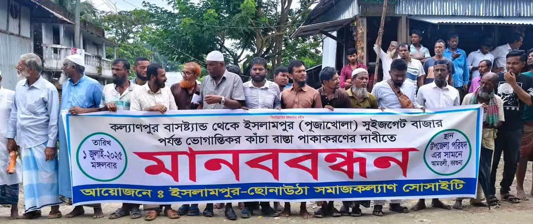আমতলী সদর ইউনিয়নের কল্যানপুর থেকে ইসলামপুর স্লুইস গেট হয়ে হাফেজ প্যাদার খেয়াঘাট পর্যন্ত পঁাচ কিলোমিটার এবং সোনাউটা রব মোল্লার বাড়ী থেকে ইসলামপুর স্লুইস গেট হয়ে টিয়াখালী বাজার পর্যন্ত তিন কিলোমিটার কাঁচা সড়ক পাকা করার দাবীতে মঙ্গলবার সকালে আমতলী উপজেলা পরিষদের সামনে শতাধিক গ্রামবাসী ঘন্টাব্যাপী মানবন্ধন কর্মসূচী পালন করেছে। ইসলামপুর হাসানিয়া দাখিল মাদ্রাসা সুপার মাওলানা শাহআলম আল মারুফ এর সভাপতিত্বে মানবন্ধন কর্মসূচীতে বক্তব্য রাখেন, হলদিয়া ইউনিয়ন পরিষদের মেম্বর মো,হারুন খান, আমতলী সদর ইউনিয়ন বিএনপির সিনিয়র সহ-সভাপতি মো. জালাল হাওলাদার, সদর ইউনিয়ন কৃষক দলের সভাপতি মো. রেজাউল করিম ও মো. আব্দুর রাজ্জাক মাষ্টার, মইনুল ইসলাম হাসান, বাইজিদ দফাদার, প্রমুখ।